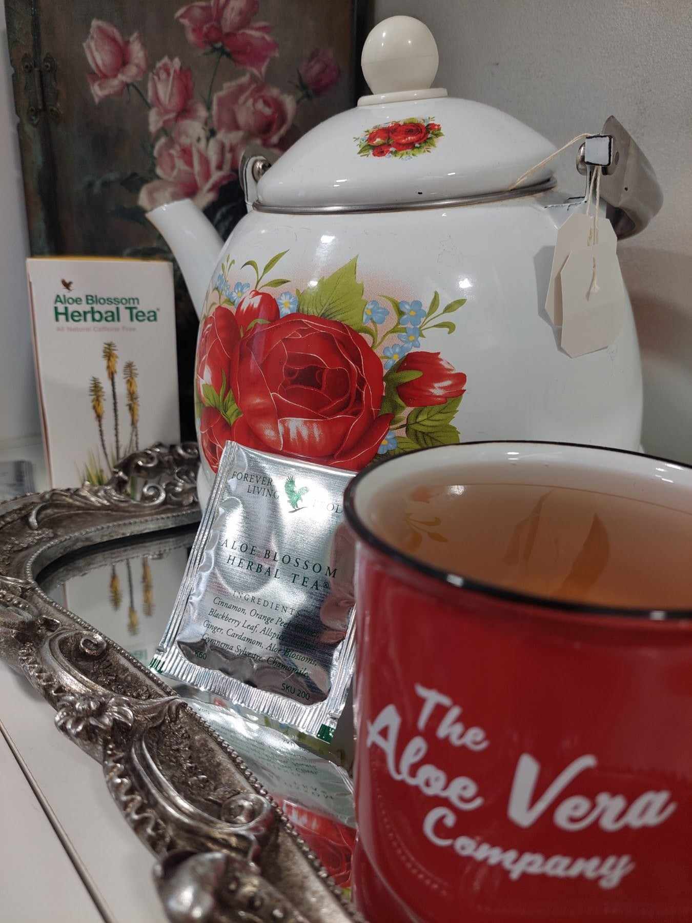 Aloe Blossom Herbal Tea je prirodna mešavina lekovitog lišća, biljaka i začina, posebno pripremljena s izvanrednim ukusom i bogatom aromom. Ovaj čaj ne sadrži kofein, pa je bezbedan za decu i pruža osećaj osveženja. Posebno podstiče veći unos tečnosti, koji je važan za razmenu materija u organizmu. Deca ga rado piju. Bez obzira da li ga pijete vrućeg ili ohladjenog Aloe Blossom Herbal Tea izvrsnog je ukusa i lagan za pripremu.